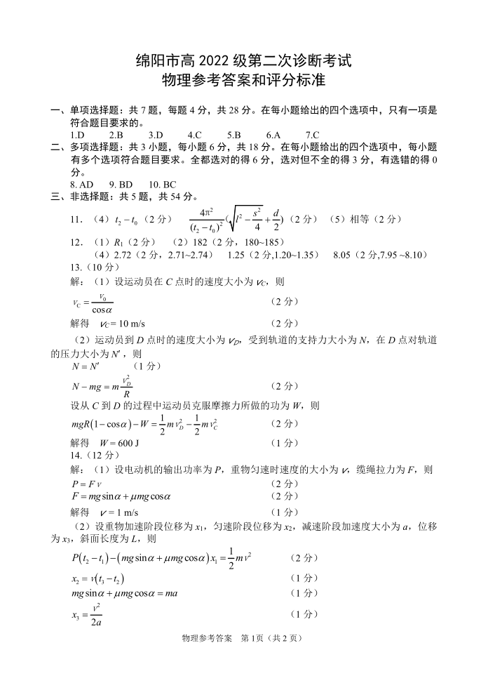 四川省绵阳市2024-2025学年上期高三第二次诊断性考试物理答案