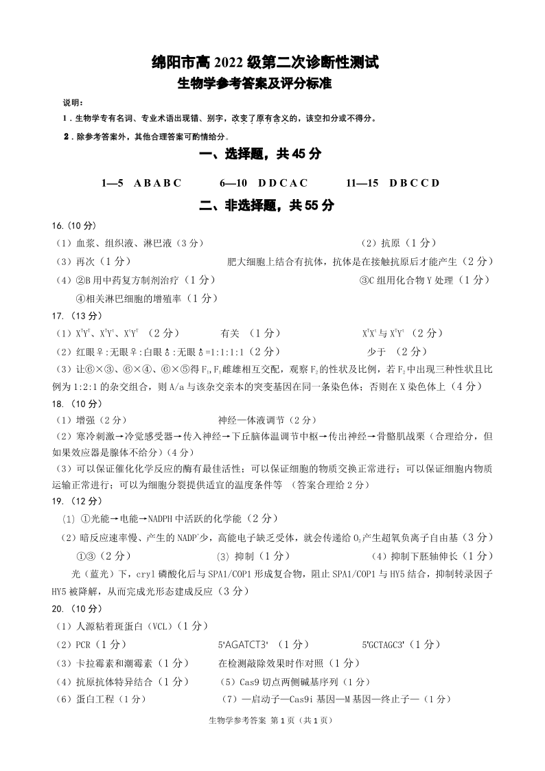 四川省绵阳市2024-2025学年上期高三第二次诊断性考试生物答案