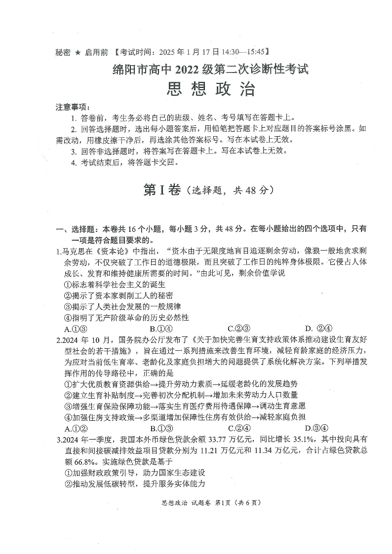 四川省绵阳市2024-2025学年上期高三第二次诊断性考试政治