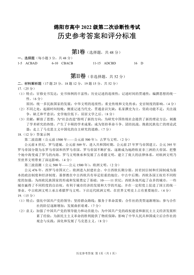 四川省绵阳市2024-2025学年上期高三第二次诊断性考试历史答案