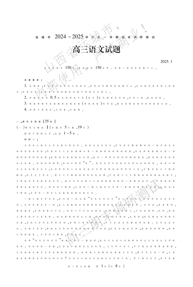 山西省运城市2024-2025学年第一学期1月高三期末调研测试语文