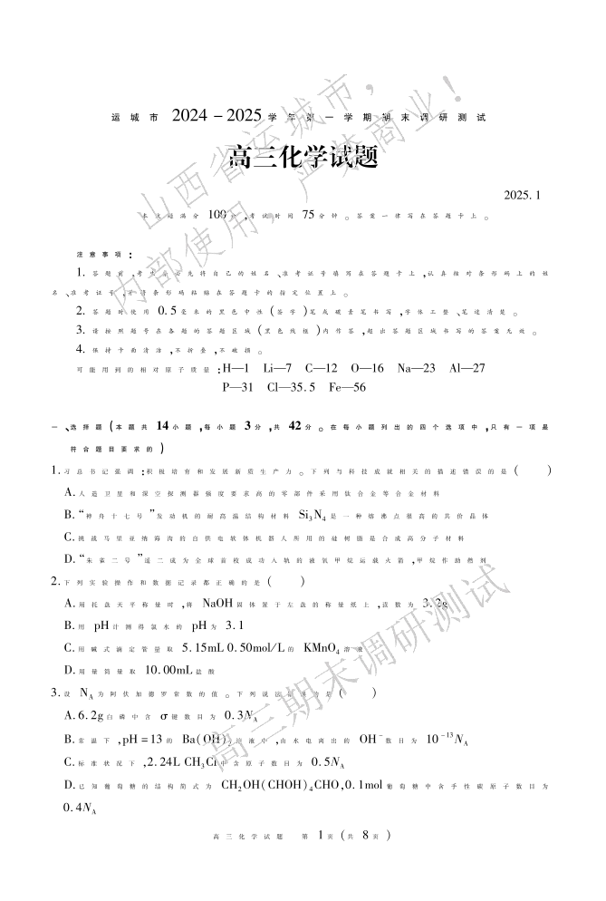 山西省运城市2024-2025学年第一学期1月高三期末调研测试化学