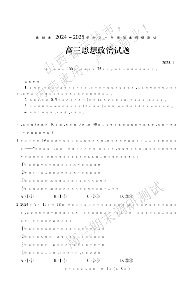 山西省运城市2024-2025学年第一学期1月高三期末调研测试政治