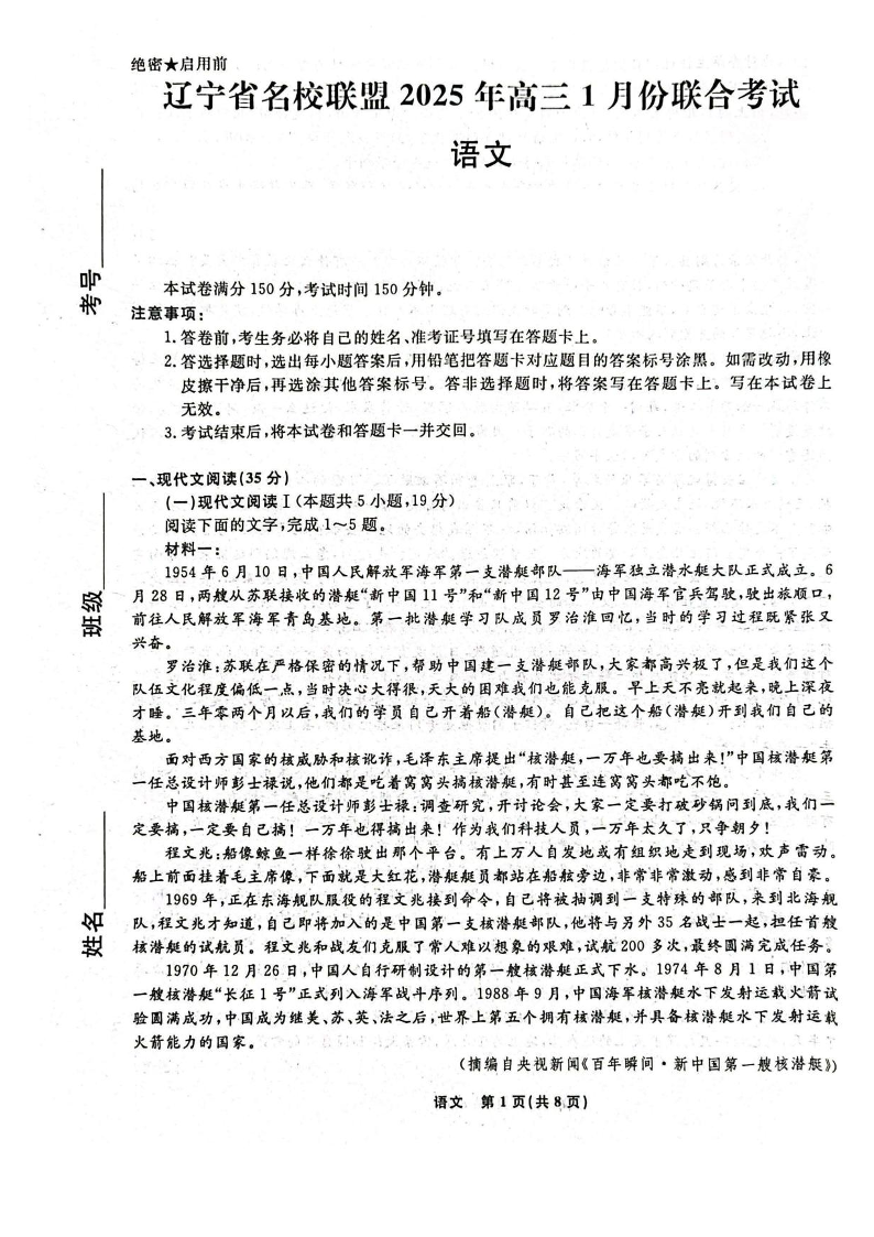辽宁省名校联盟2024-2025学年上学1月高三联合考试语文+答案