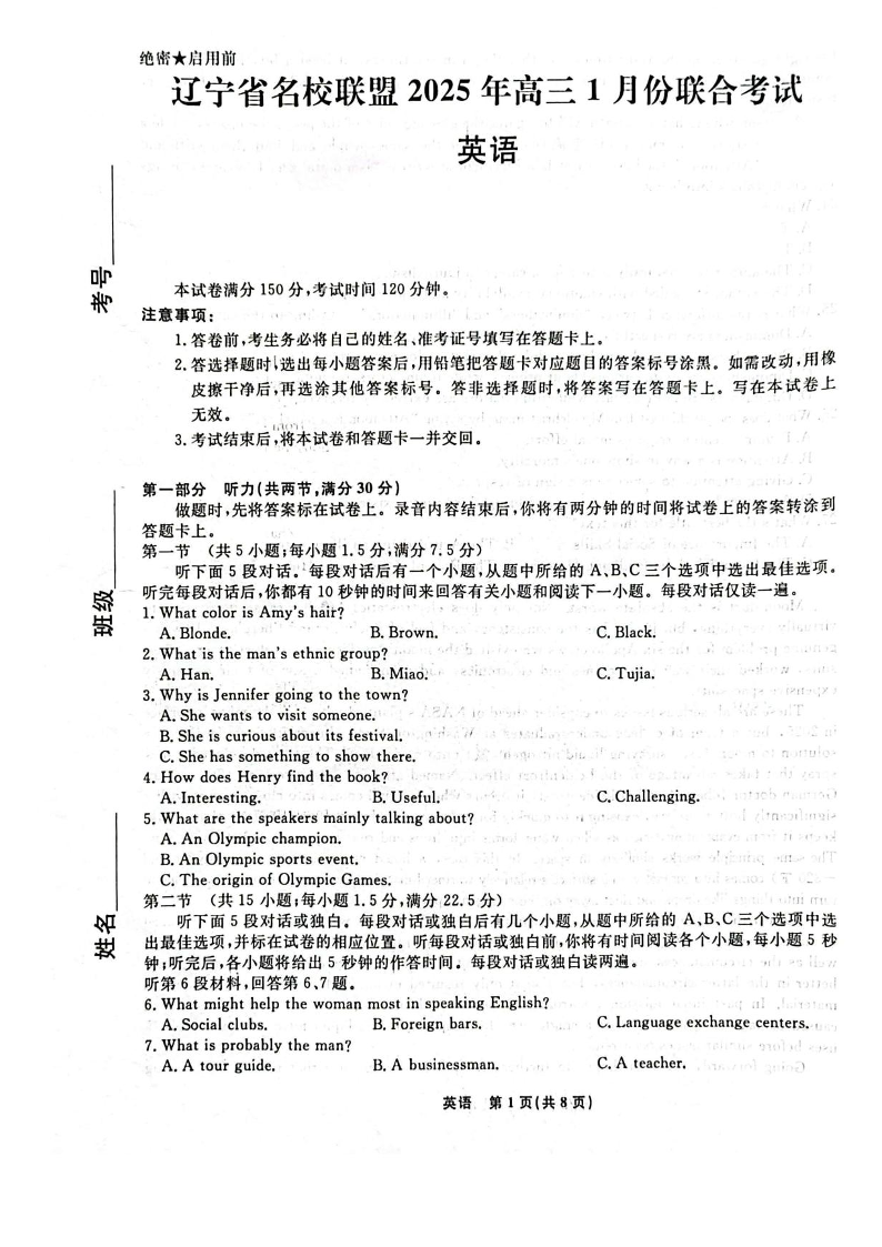 辽宁省名校联盟2024-2025学年上学1月高三联合考试英语+答案