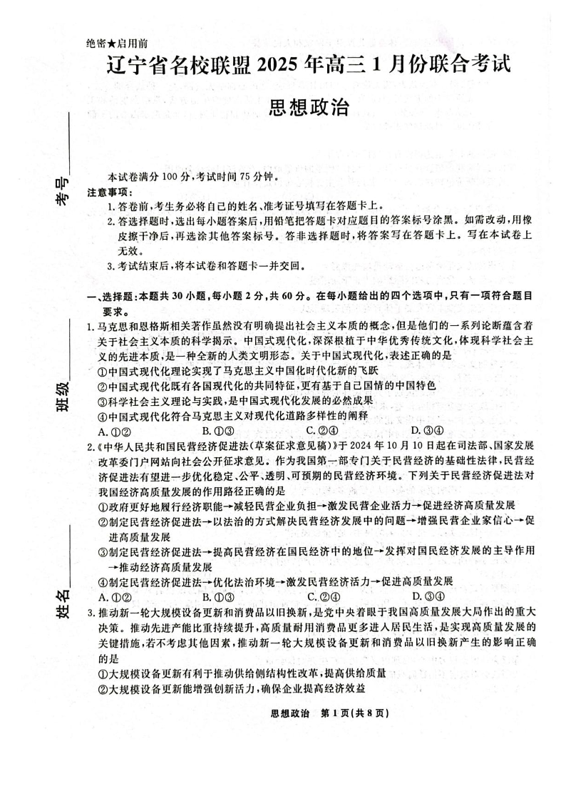 辽宁省名校联盟2024-2025学年上学1月高三联合考试政治+答案