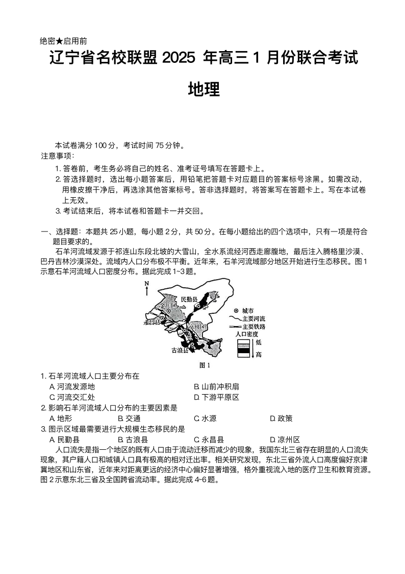 辽宁省名校联盟2024-2025学年上学1月高三联合考试地理+答案