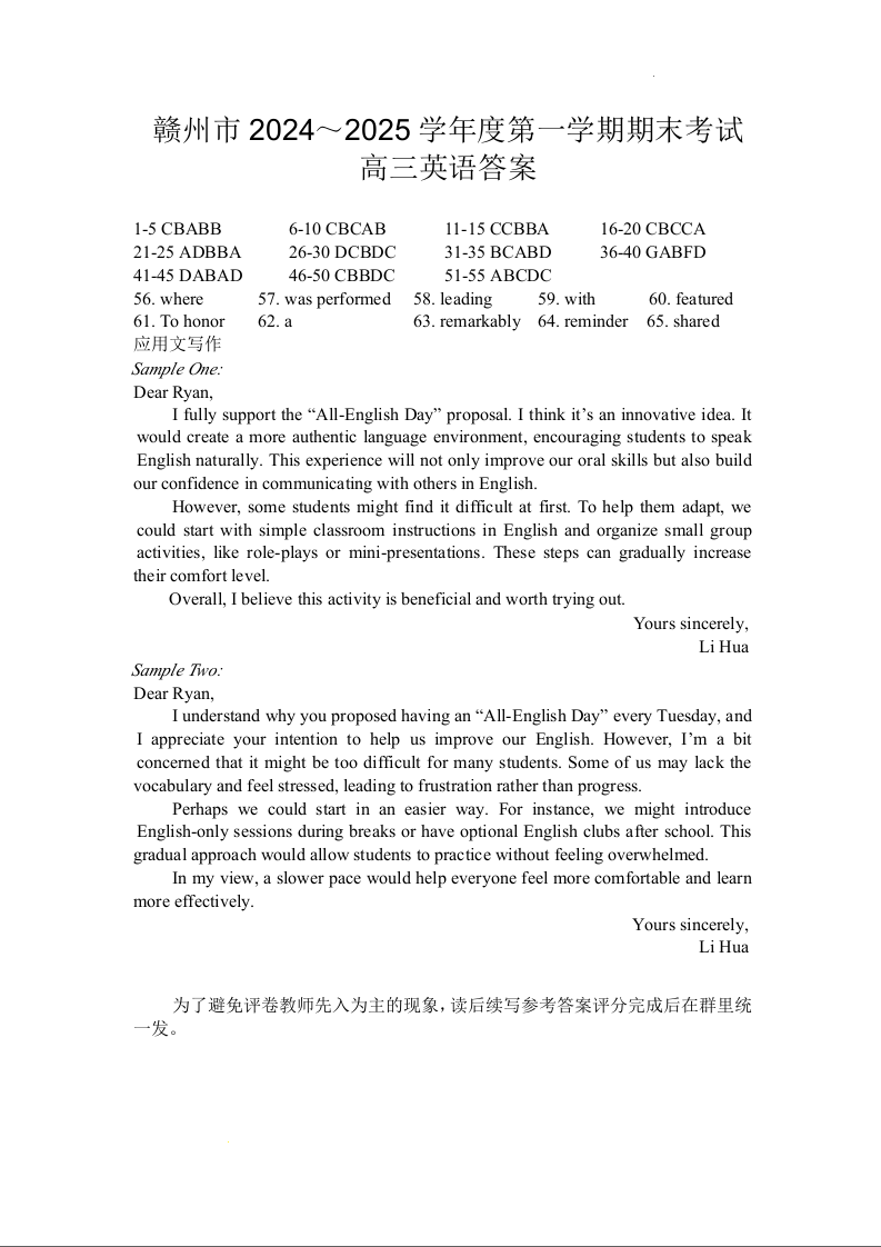 江西省赣州市2024-2025学年上学期1月高三期末考试英语答案