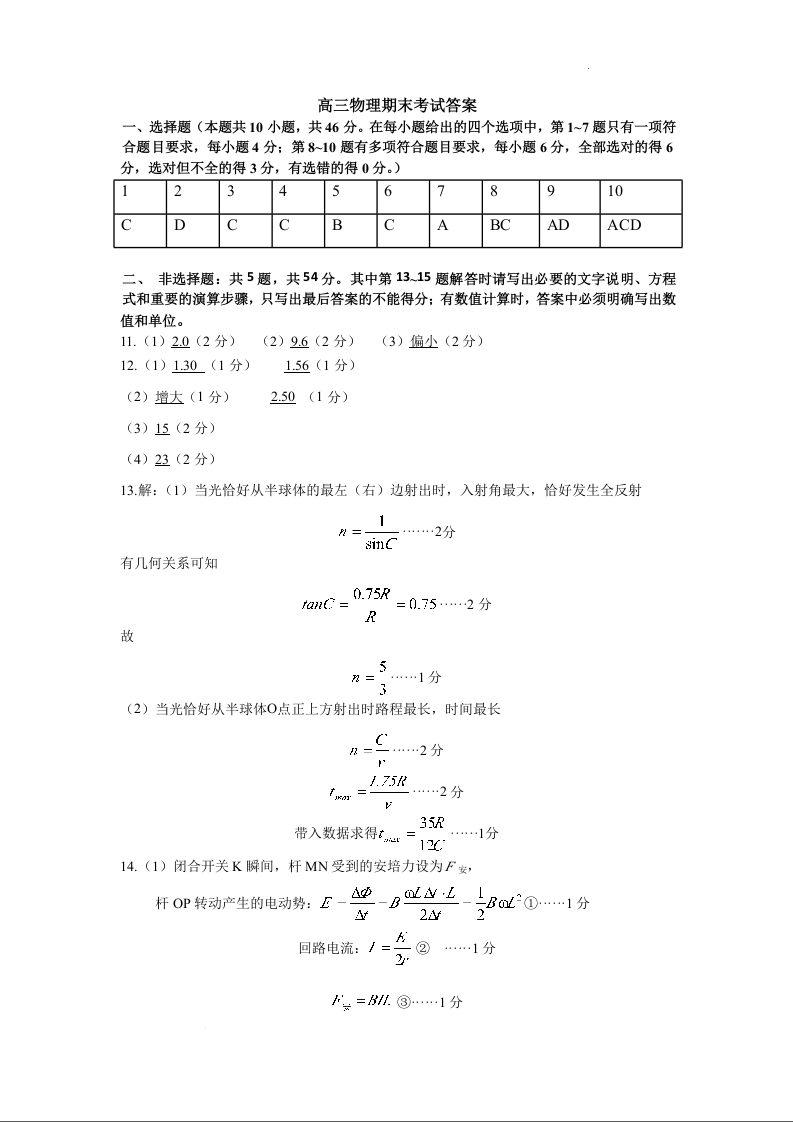 江西省赣州市2024-2025学年上学期1月高三期末考试物理答案