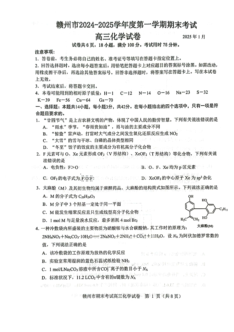 江西省赣州市2024-2025学年上学期1月高三期末考试化学