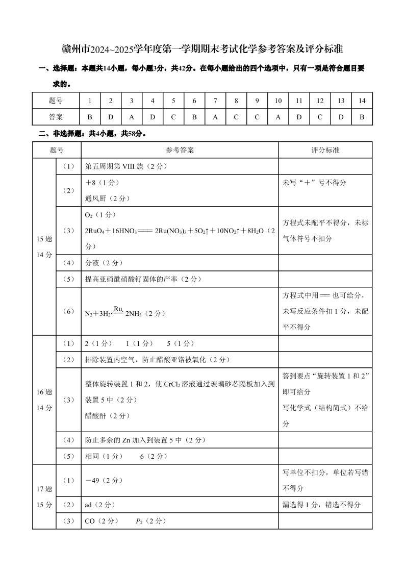 江西省赣州市2024-2025学年上学期1月高三期末考试化学答案