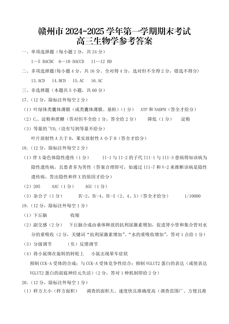 江西省赣州市2024-2025学年上学期1月高三期末考试生物答案