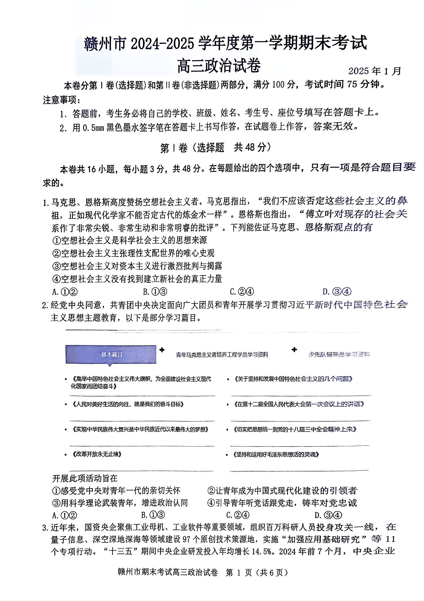 江西省赣州市2024-2025学年上学期1月高三期末考试政治