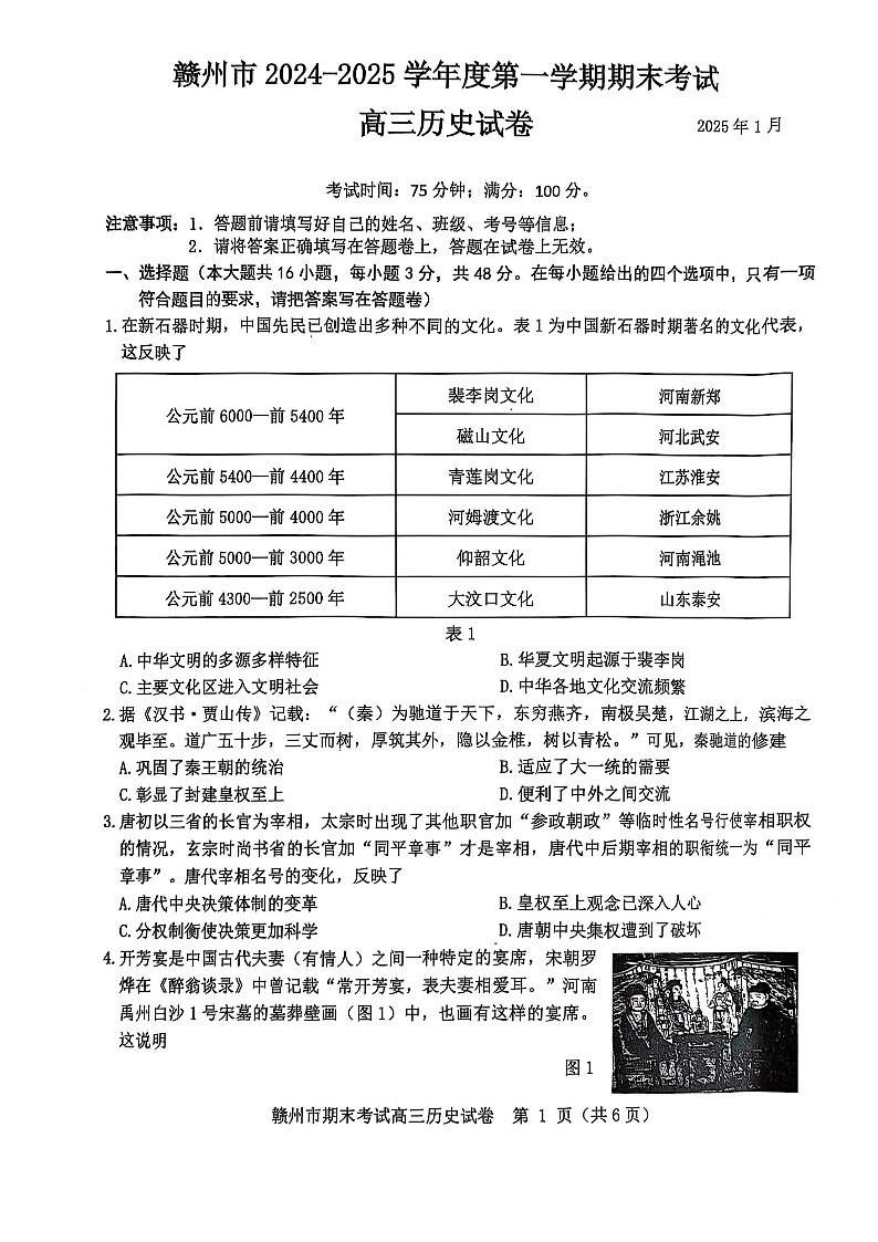 江西省赣州市2024-2025学年上学期1月高三期末考试历史
