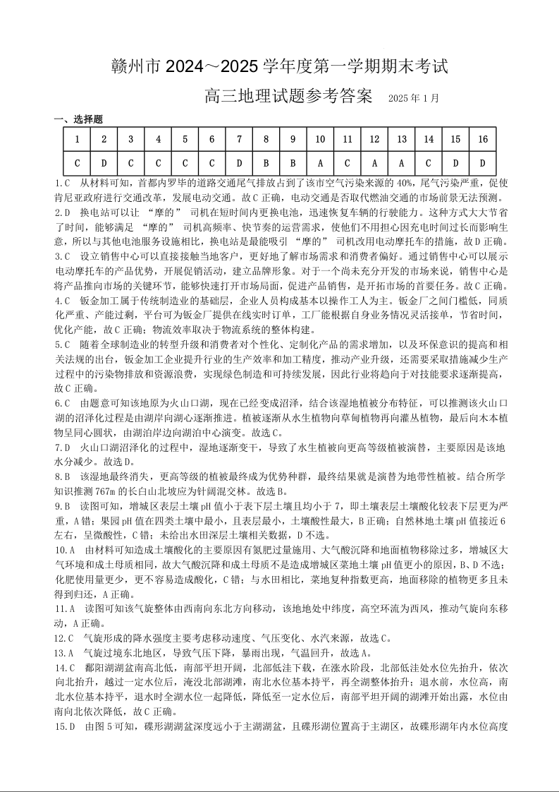 江西省赣州市2024-2025学年上学期1月高三期末考试地理答案