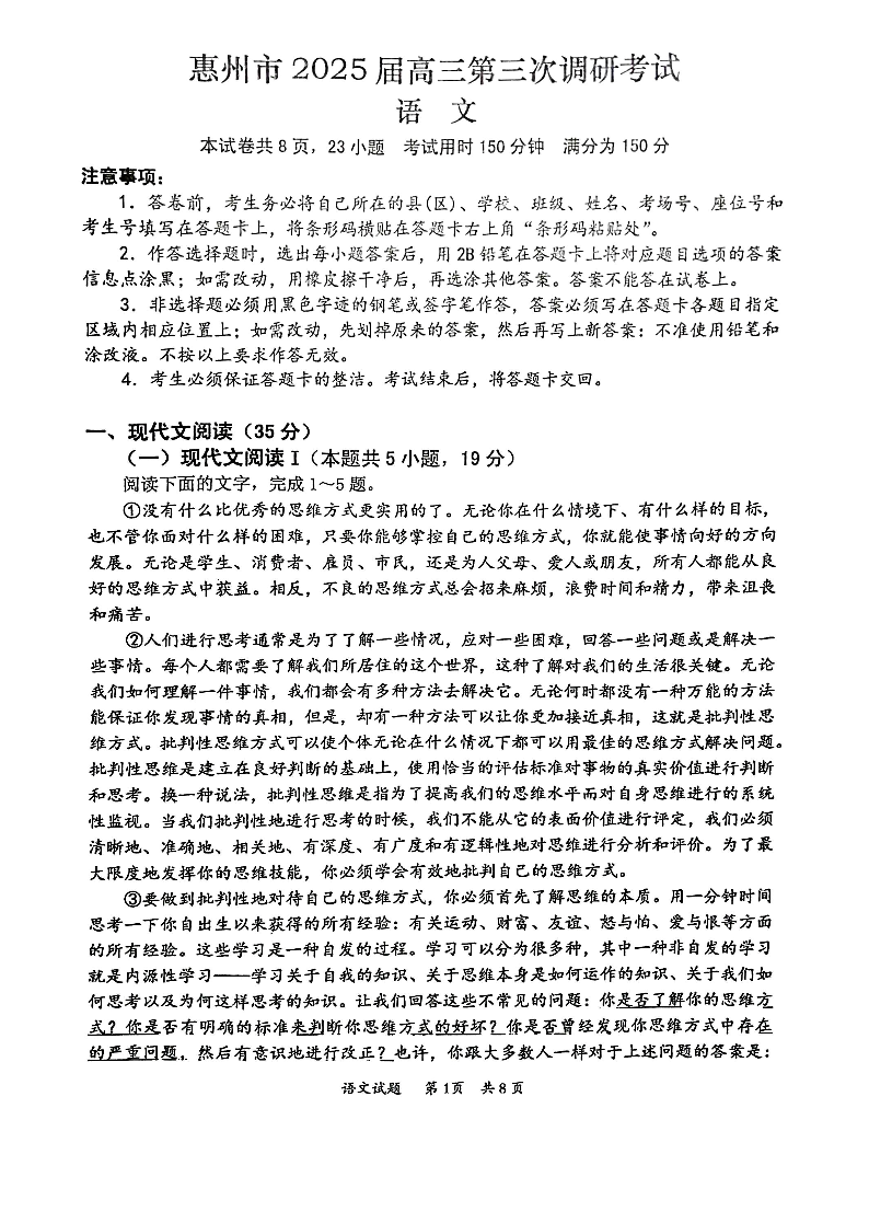 广东省惠州市2024-2025学年上1月高三第三次调研考试语文