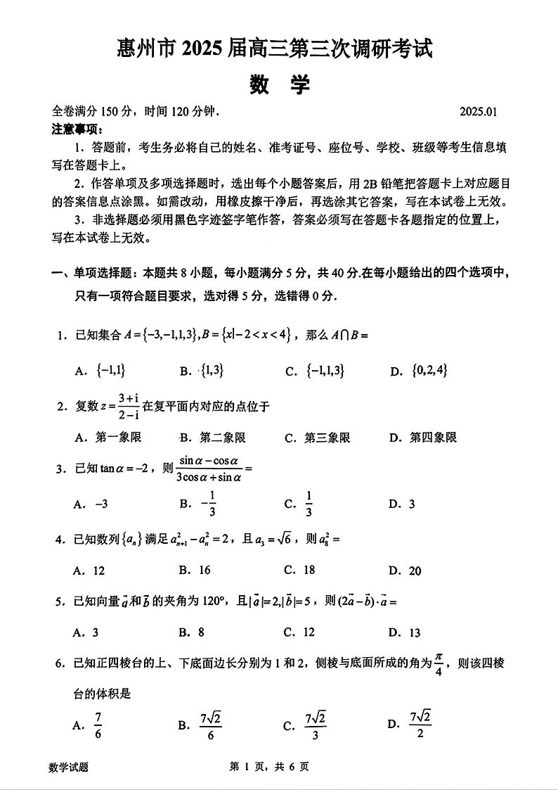 广东省惠州市2024-2025学年上1月高三第三次调研考试数学