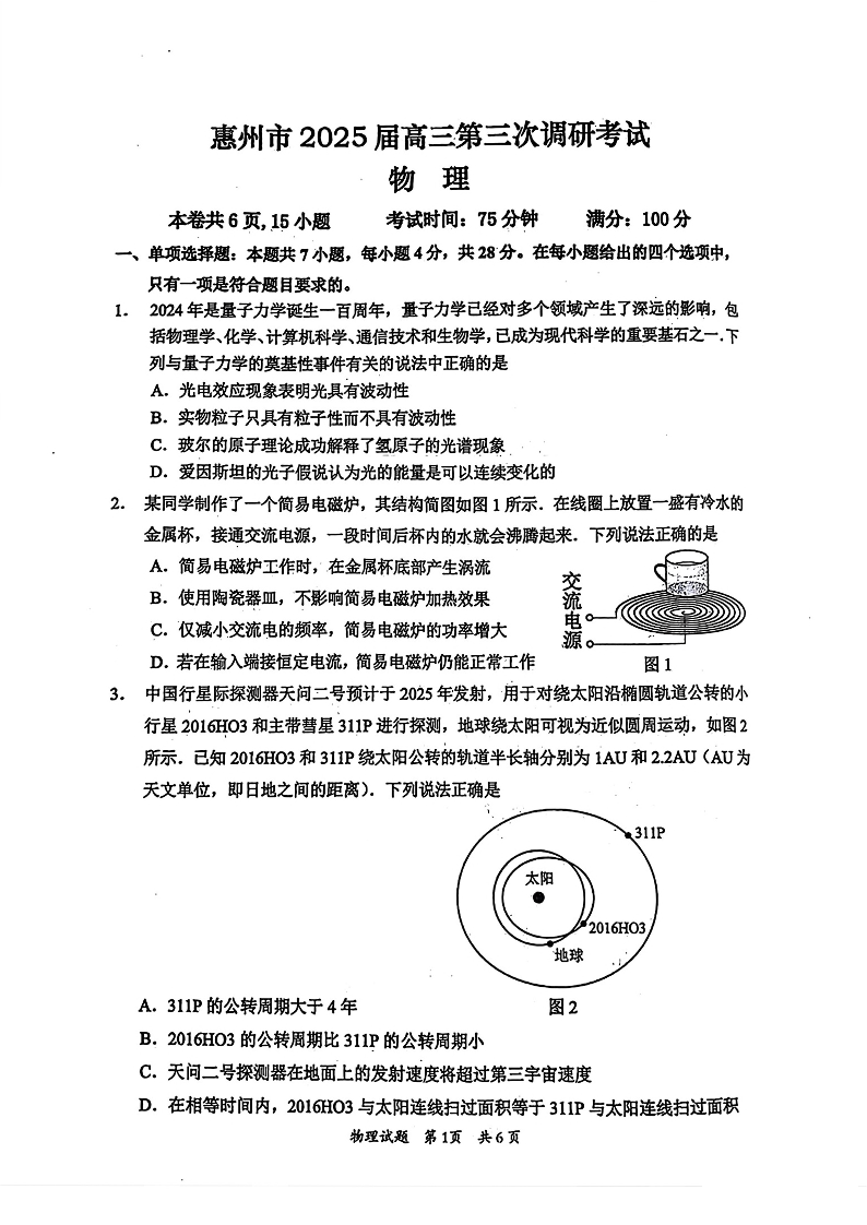 广东省惠州市2024-2025学年上1月高三第三次调研考试物理+答案