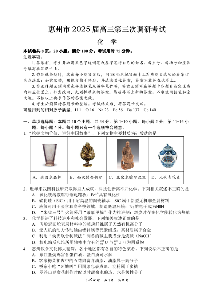 广东省惠州市2024-2025学年上1月高三第三次调研考试化学