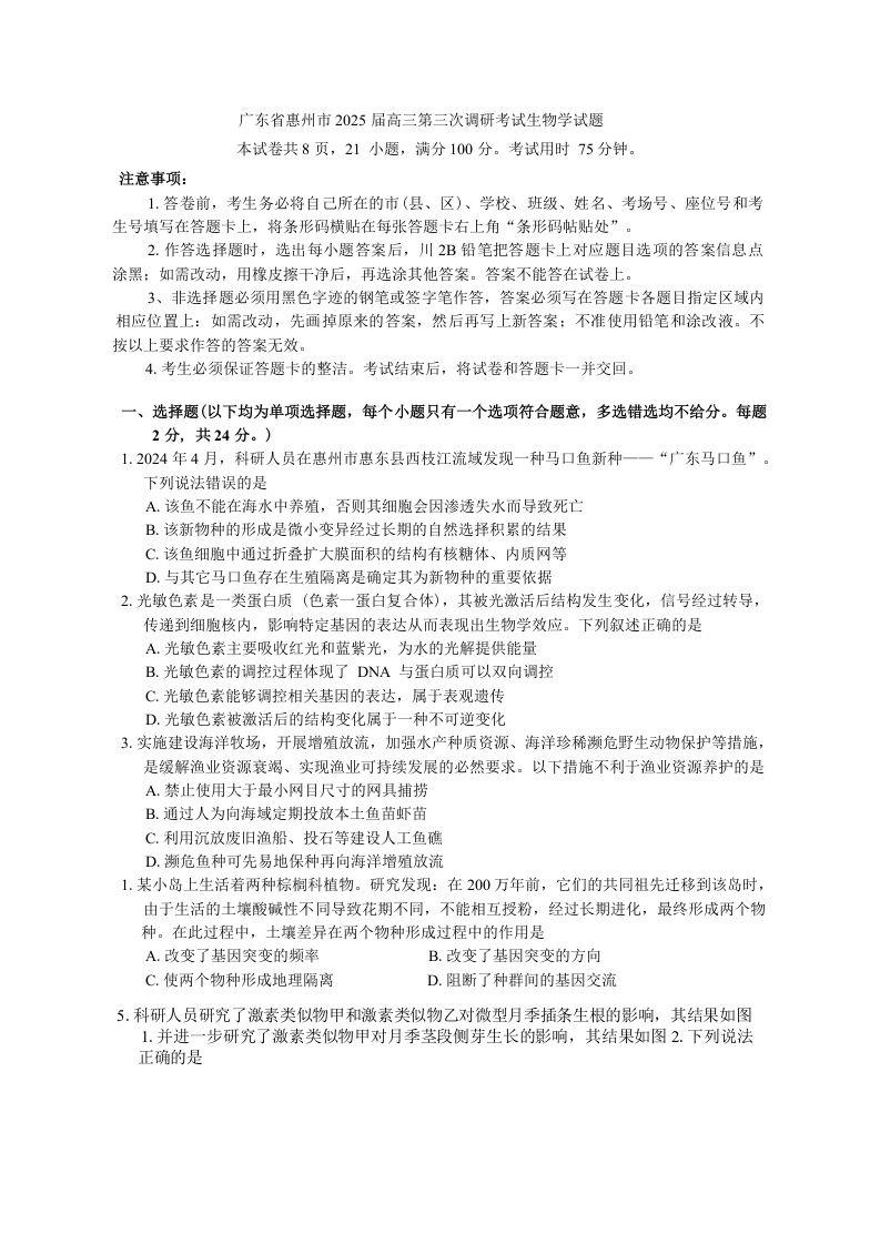 广东省惠州市2024-2025学年上1月高三第三次调研考试生物+答案