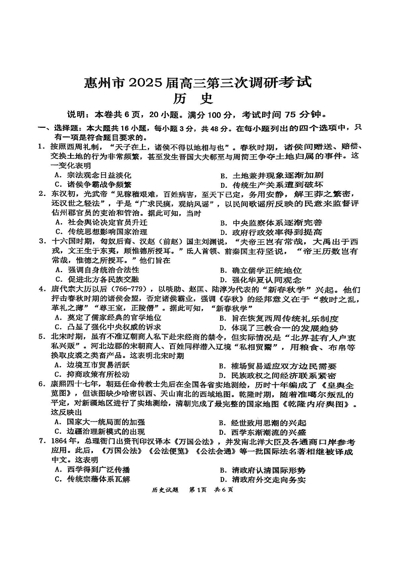 广东省惠州市2024-2025学年上1月高三第三次调研考试历史+答案