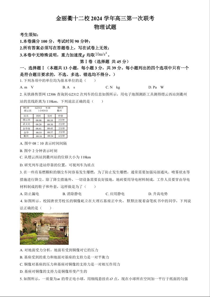 浙江省金丽衢十二校2024-2025学年上学期高三第一次联考物理(原卷版)