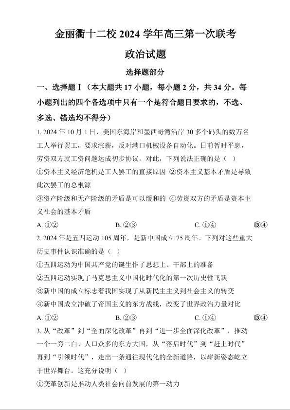 浙江省金丽衢十二校2024-2025学年上学期高三第一次联考政治(原卷版)