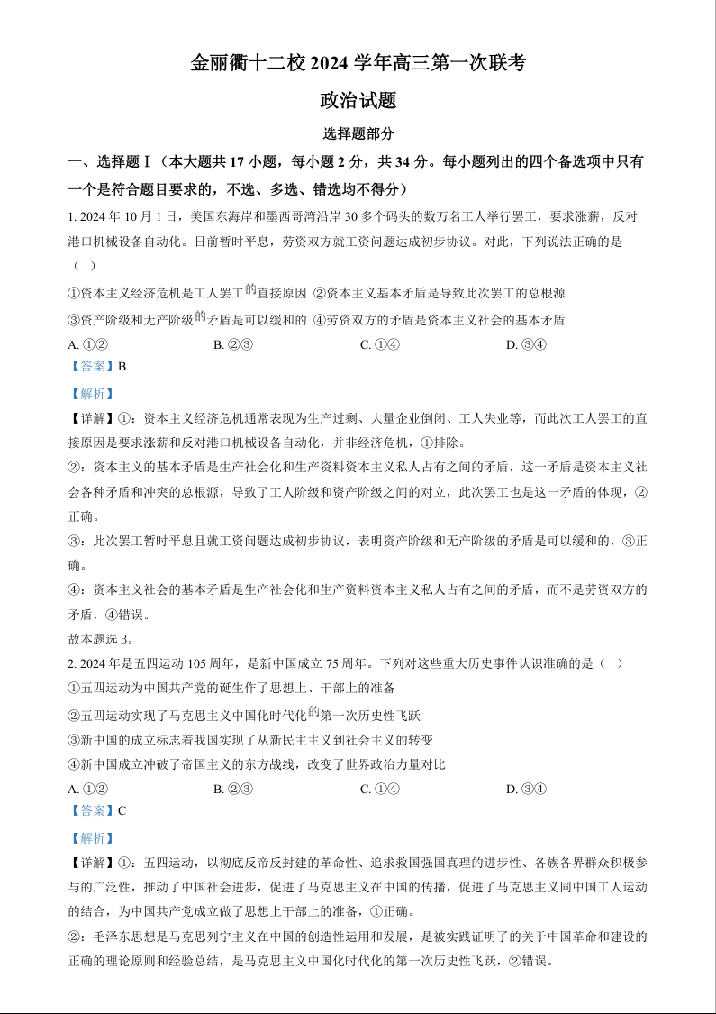 浙江省金丽衢十二校2024-2025学年上学期高三第一次联考政治(解析版)