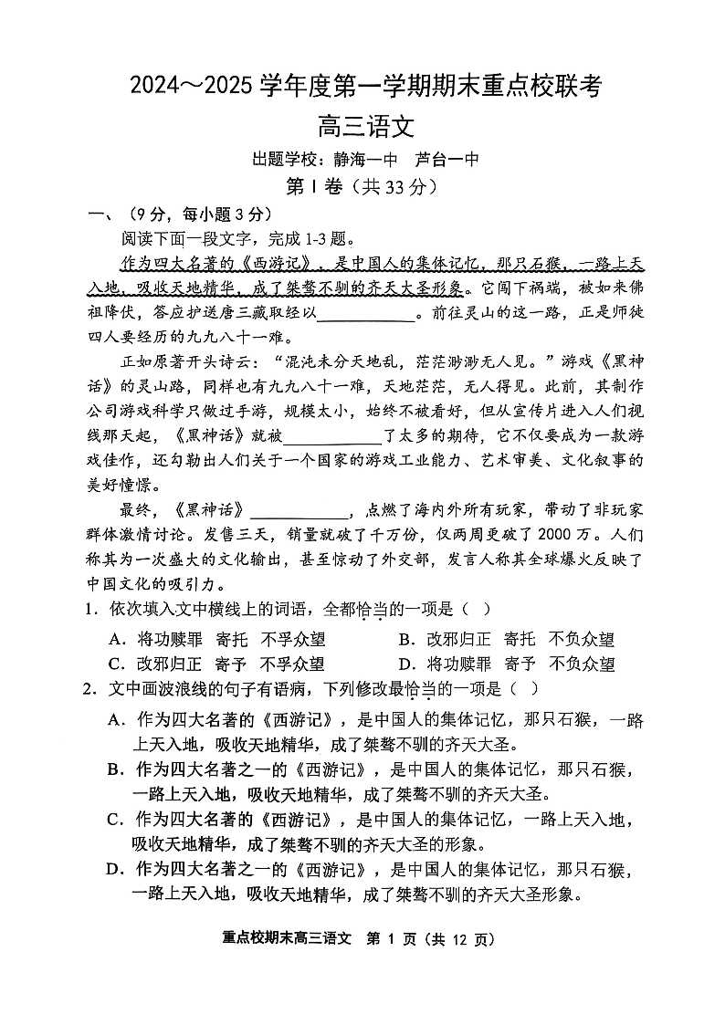 天津市五区县重点校2024-2025学年上学期1月高三期末联考语文