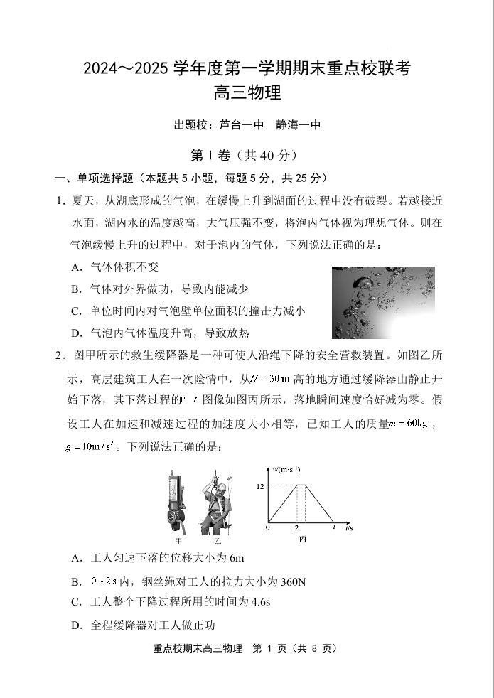 天津市五区县重点校2024-2025学年上学期1月高三期末联考物理