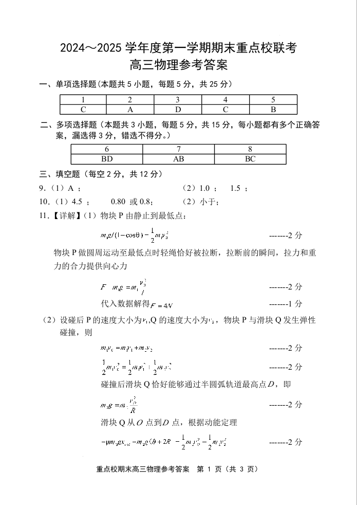 天津市五区县重点校2024-2025学年上学期1月高三期末联考物理答案