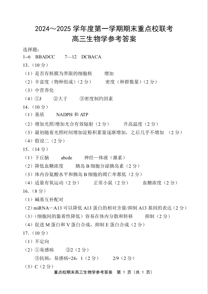天津市五区县重点校2024-2025学年上学期1月高三期末联考生物答案