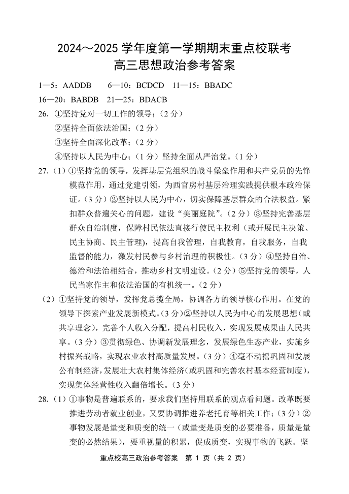 天津市五区县重点校2024-2025学年上学期1月高三期末联考政治答案