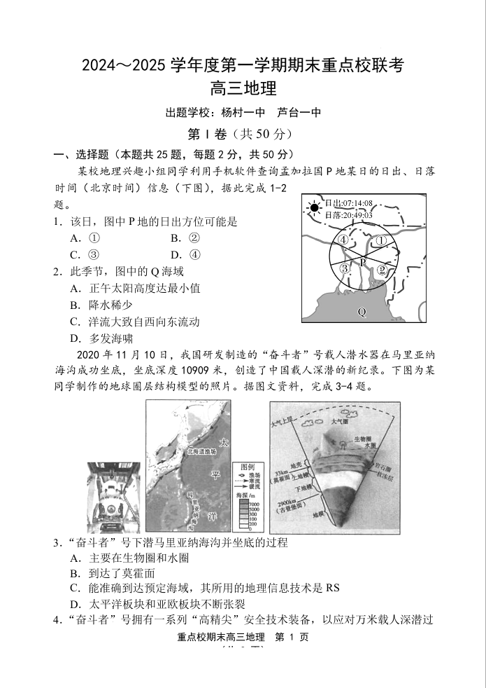 天津市五区县重点校2024-2025学年上学期1月高三期末联考地理