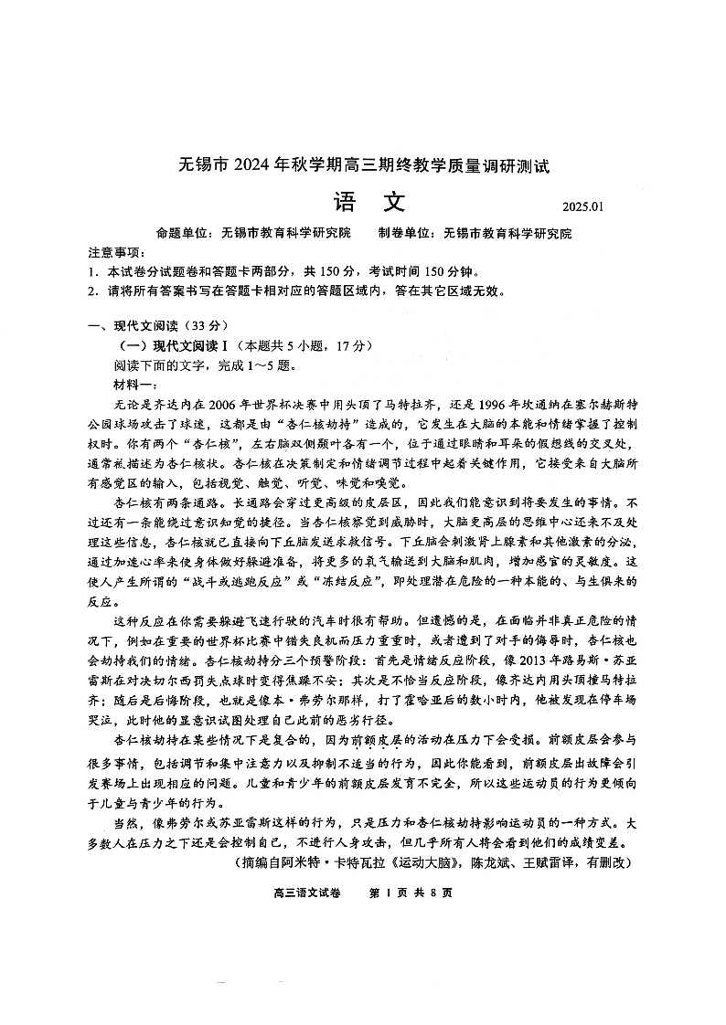 江苏省无锡市2024-2025学年上学期1月高三期终教学质量调研测试语文