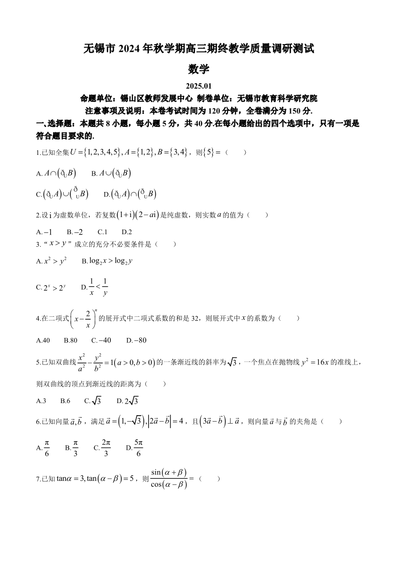 江苏省无锡市2024-2025学年上学期1月高三期终教学质量调研测试数学+答案