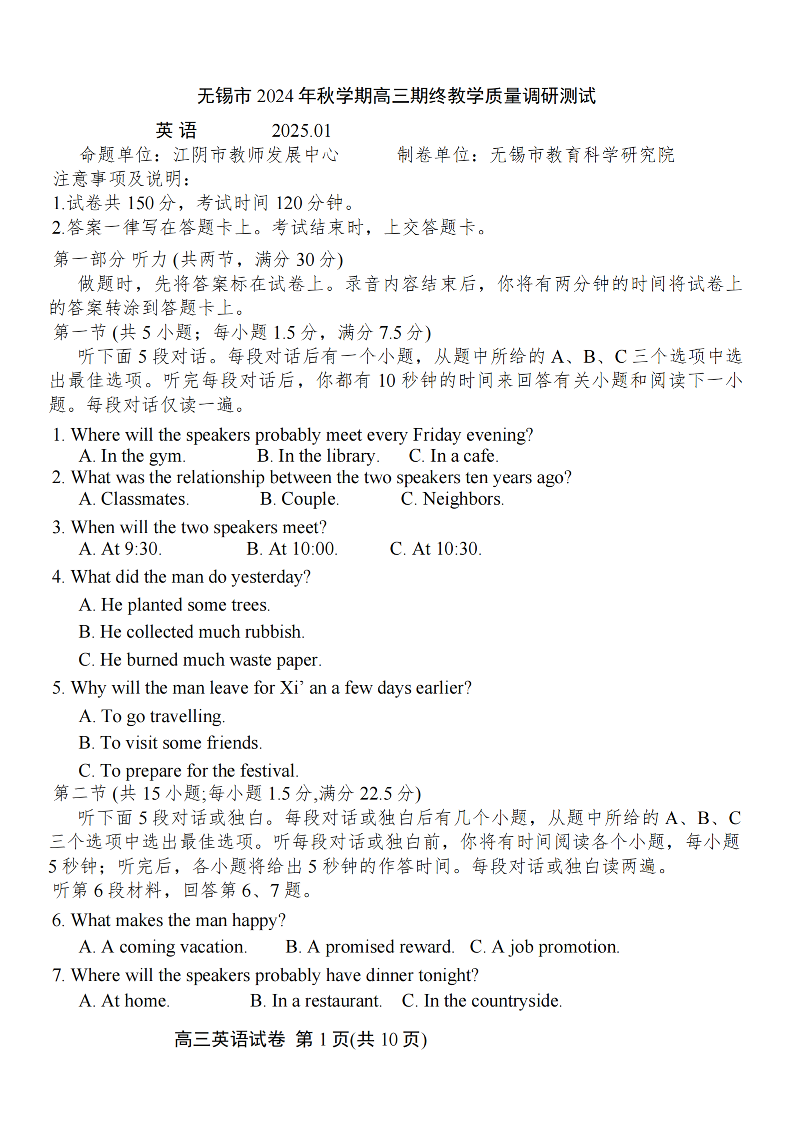 江苏省无锡市2024-2025学年上学期1月高三期终教学质量调研测试英语