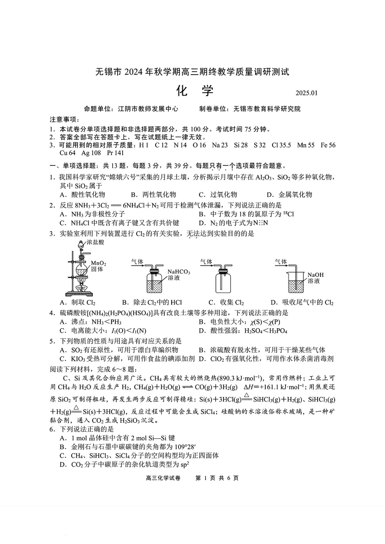 江苏省无锡市2024-2025学年上学期1月高三期终教学质量调研测试化学+答案