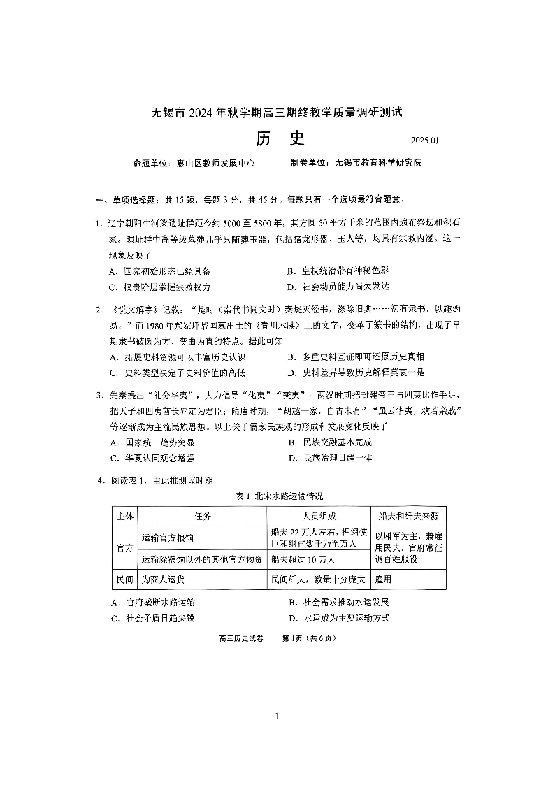 江苏省无锡市2024-2025学年上学期1月高三期终教学质量调研测试历史+答案