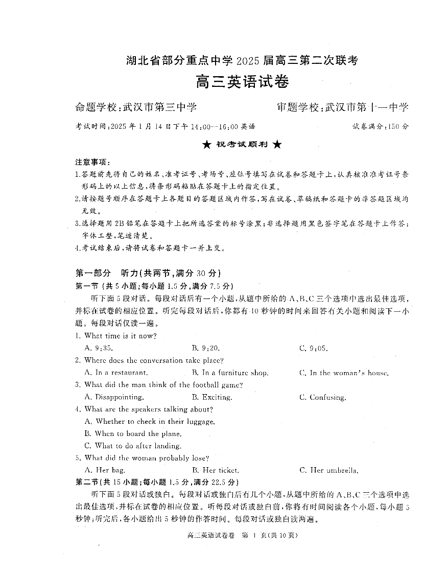 湖北省重点中学2024-2025学年上学期1月 高三第二次联考英语