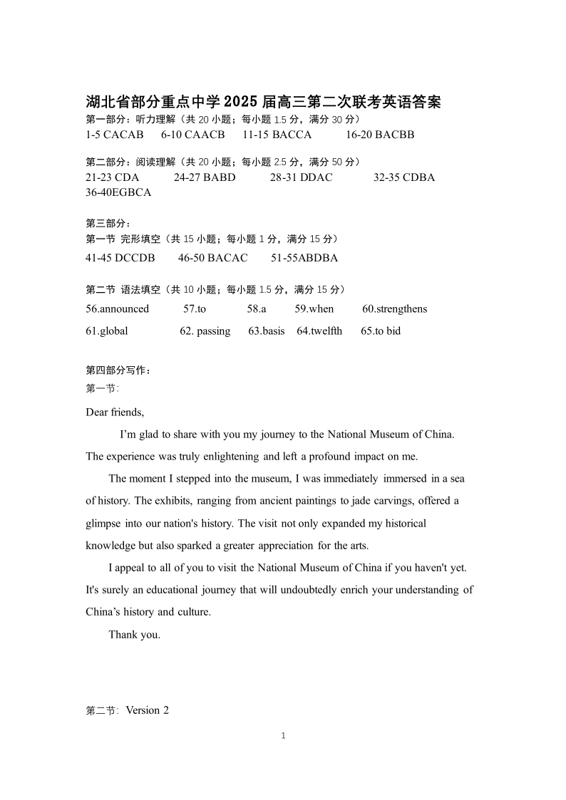 湖北省重点中学2024-2025学年上学期1月 高三第二次联考英语答案