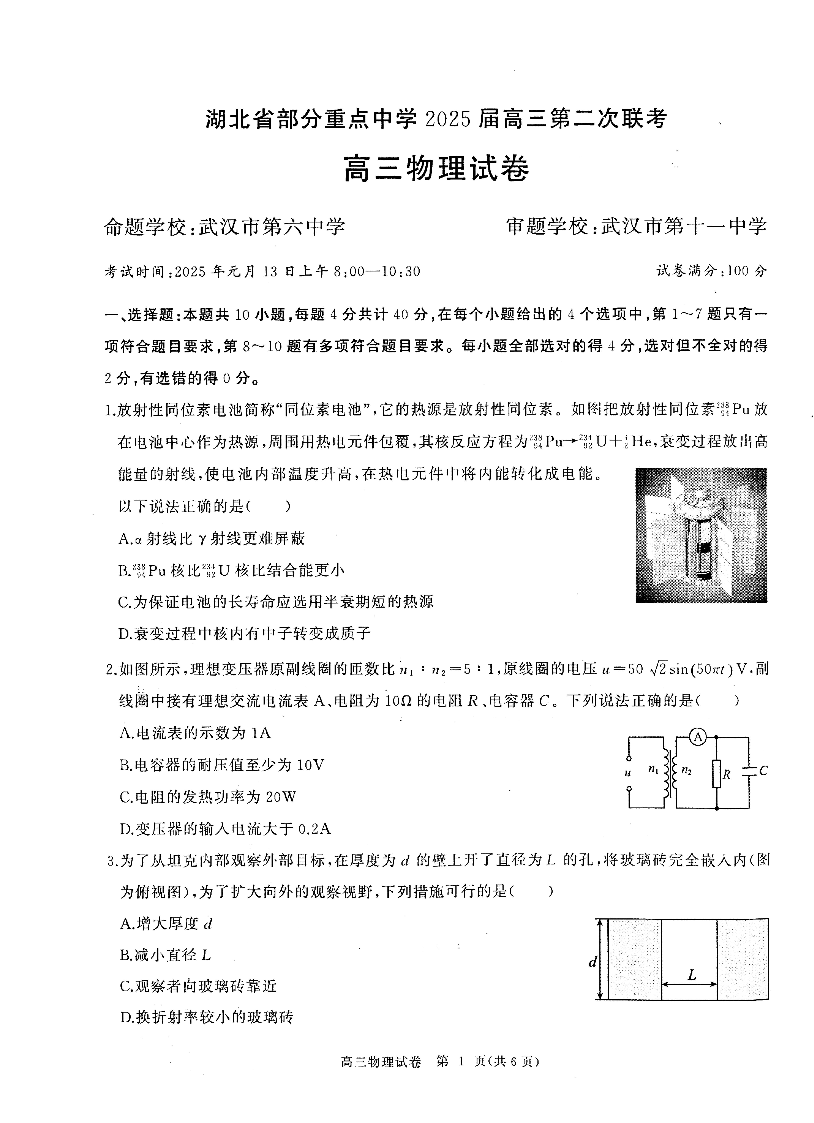 湖北省重点中学2024-2025学年上学期1月 高三第二次联考物理