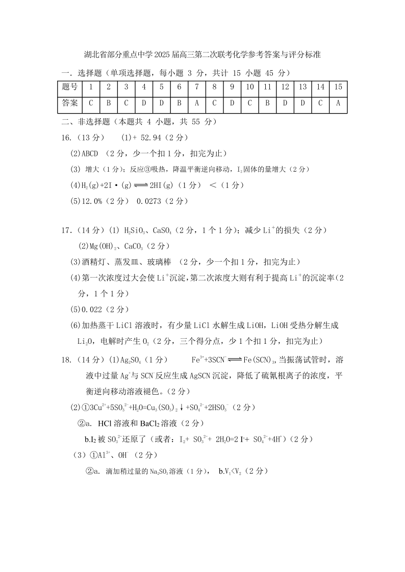 湖北省重点中学2024-2025学年上学期1月 高三第二次联考化学答案