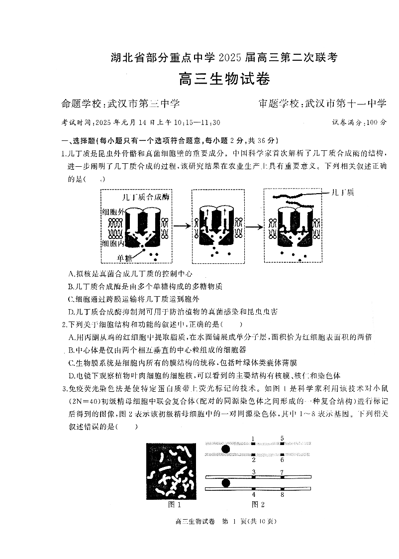 湖北省重点中学2024-2025学年上学期1月 高三第二次联考生物