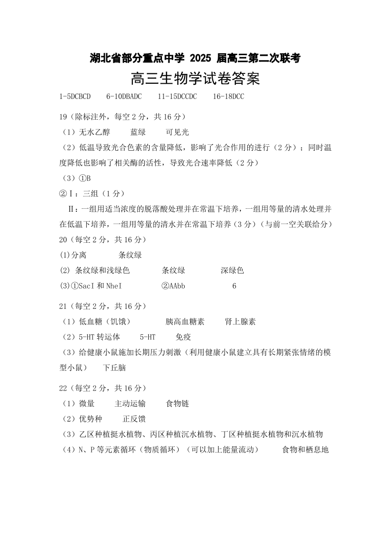 湖北省重点中学2024-2025学年上学期1月 高三第二次联考生物答案