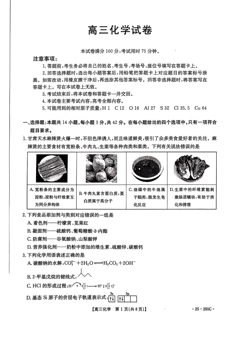 甘肃省区域高中2024-2025学年上学期1月高三联考化学+答案