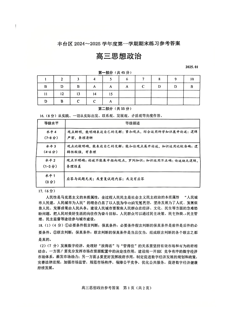 北京市丰台区2024-2025年上学期1月高三期末考试政治答案
