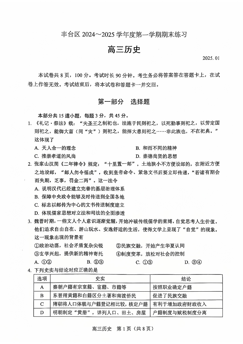 北京市丰台区2024-2025年上学期1月高三期末考试历史+答案