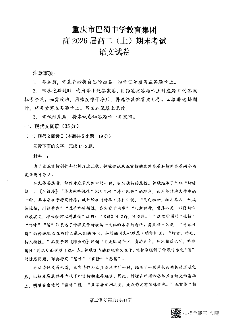 重庆市巴蜀中学教育集团2024-2025学年上学期高二期末考试语文