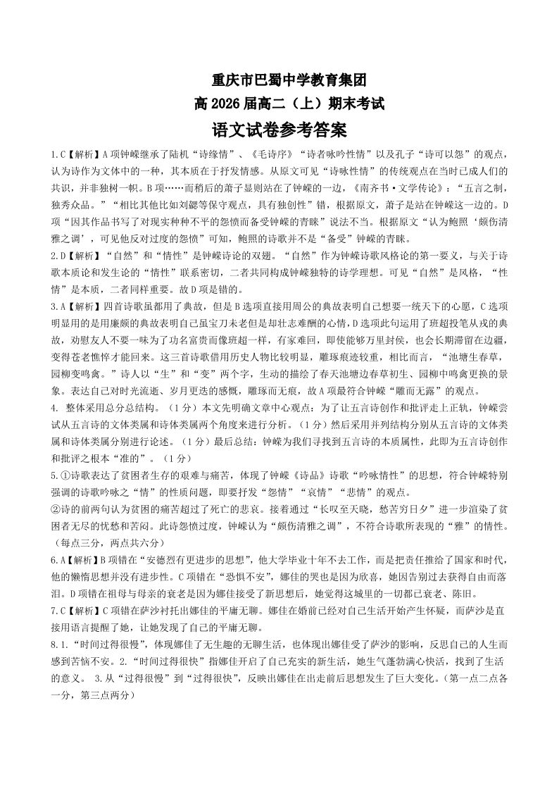 重庆市巴蜀中学教育集团2024-2025学年上学期高二期末考试语文答案